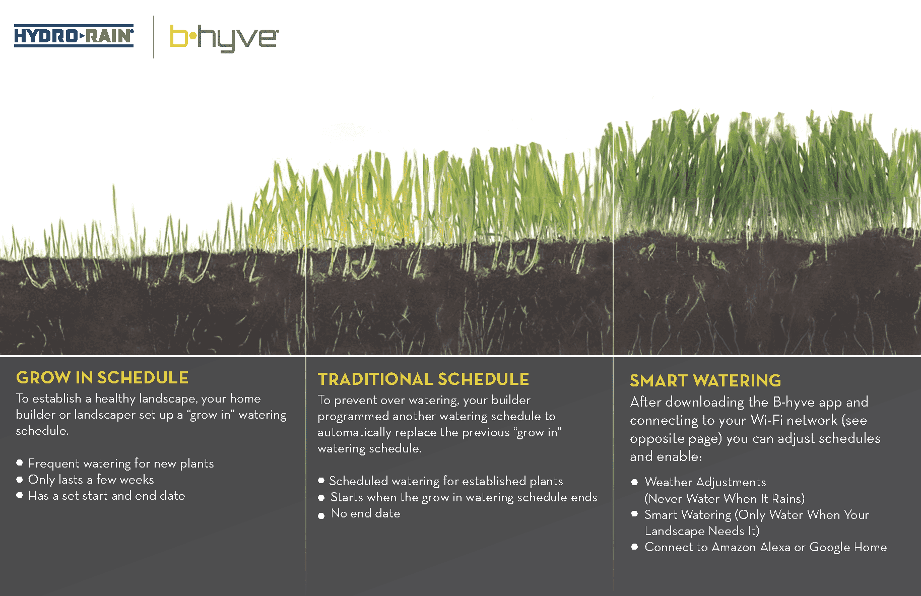 New Lawns and plants generally require additional water until they have established their roots. Historically this required the landscaper or contractor to schedule a call back to update the controller. With Program Scheduling you can provide the additional water to the plants then automatically transition to a long-term schedule. Since all the programming can done over Bluetooth® in the B-hyve Pro app you can set the schedule on site and walk away. The controller will save the program in non-volatile memory and operate as programmed.
